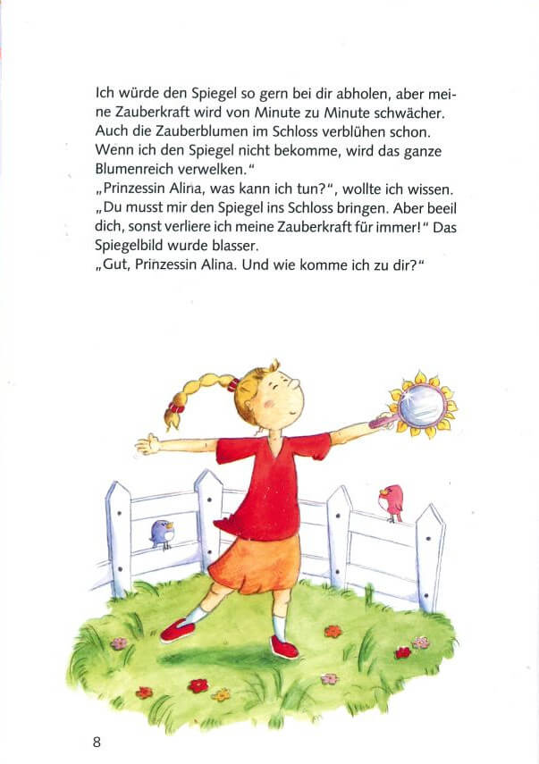 Mitten im Gras findet Ihre Tochter einen magischen Spiegel. Das ist der Spiegel der Blumenprinzessin.